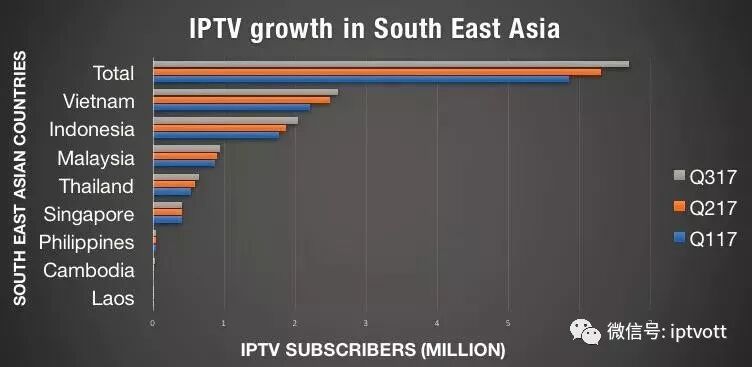 市场数据 东南亚IPTV:Dataxis最新报告发现,IPTV订户的份额在柬埔寨、印尼、老挝、马来西亚、菲律宾、新加坡、泰国和越南市场均有所增长。从7月到9月,IPTV订户增长了6%,目前共有670万。