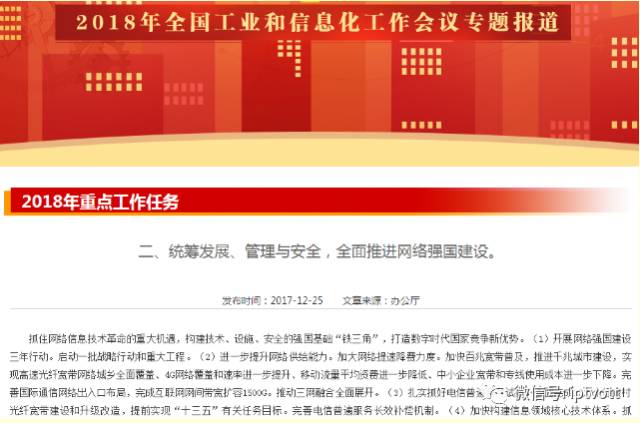工信部:12月25日,从工信部官网了解到,工信部在“2018年重点工作任务”中表示,2018年将加快百兆宽带普及,实现高速光纤宽带网络城乡全面覆盖、移动流量平均资费进一步降低。