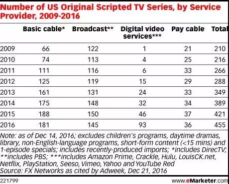 据FX Networks研究指出,从2009到2016年,美国广播、有线和流媒体视频产出的剧情剧集数量增长了一倍多,近期的增量全部来自数字端。