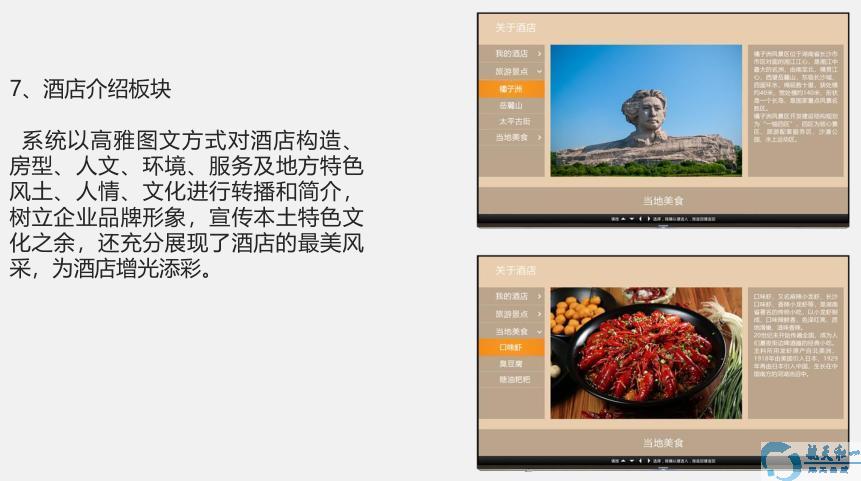 酒店IPTV系统以高雅图文方式对酒店构造、房型、人文环境、服务及地方特色,风土人情,文化进行传播和宣传介绍,树立企业品牌形象,宣传本土特色文化之余,还充分展现了酒店的最美风采,为酒店增光添彩。