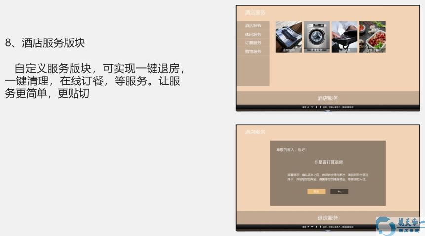 酒店iptv系统软件可以自定义服务板块,可实现电视在线退房,客房清理,在线订餐,叫醒服务,客房送物,预定机票,景点票务销售等众多服务,让服务更简单,更贴进客人需求。