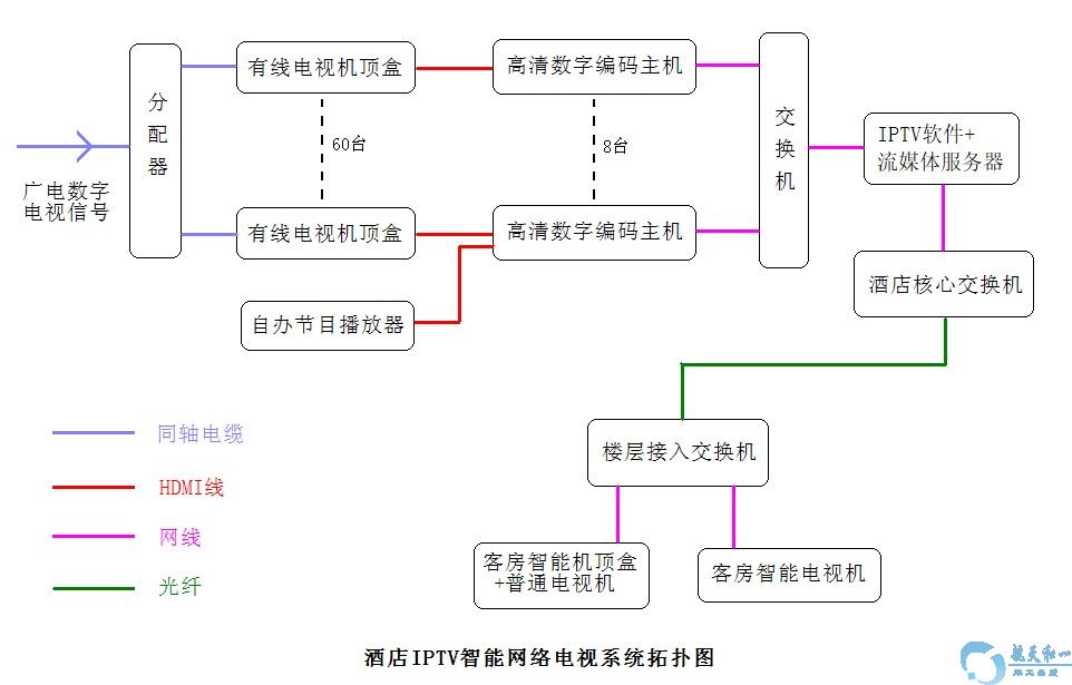 设备应用于酒店宾馆IPTV网络互动电视系统拓扑图: