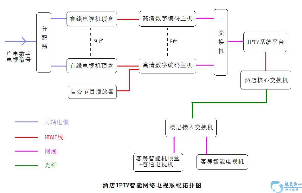 星级酒店iptv智能网络互动流媒体电视系统拓扑图: