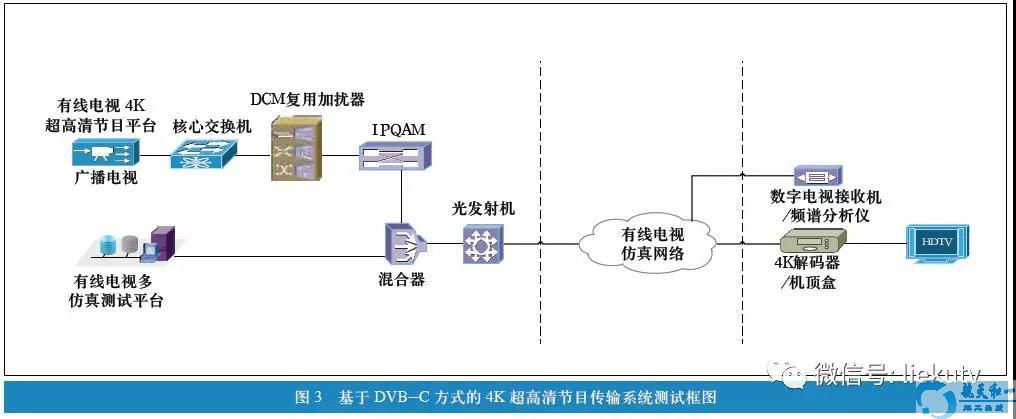 在实验室环境下,搭建HFC 实验网络,部署基于DVB-C 方式的4K 超高清节目传输系统,进行4K 节目图像主观评价,并确定电平、调制方式及MER 等有线电视网络系统的关键指标参数建议值。并针对4K 超高清节目传输系统特点,搭建了有线电视仿真网络和多业务仿真测试平台,测试评估4K 超高清节目传输对有线广播电视基本业务的影响。基于DVB-C 方式的4K 超高清节目传输系统测试框图如图3。